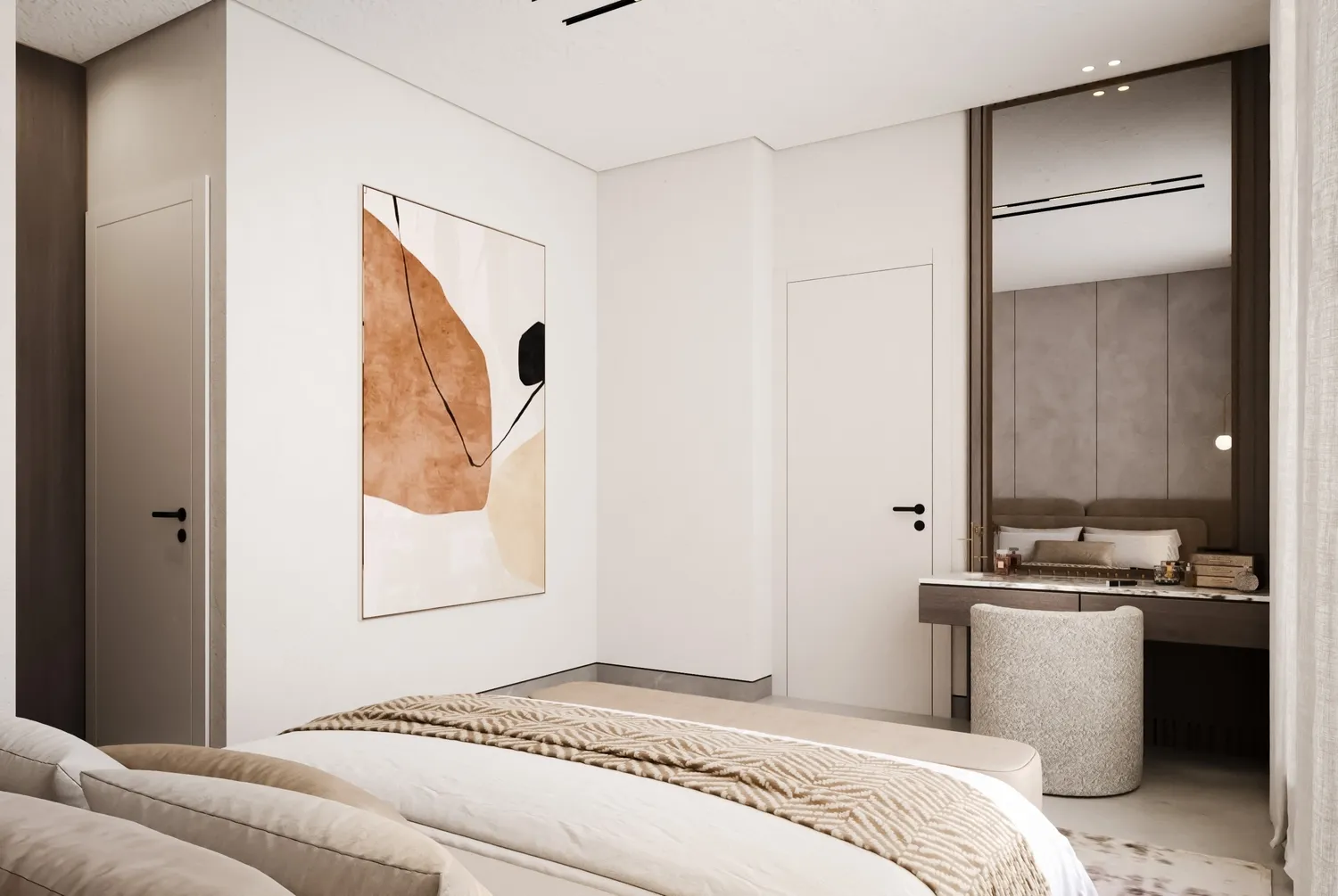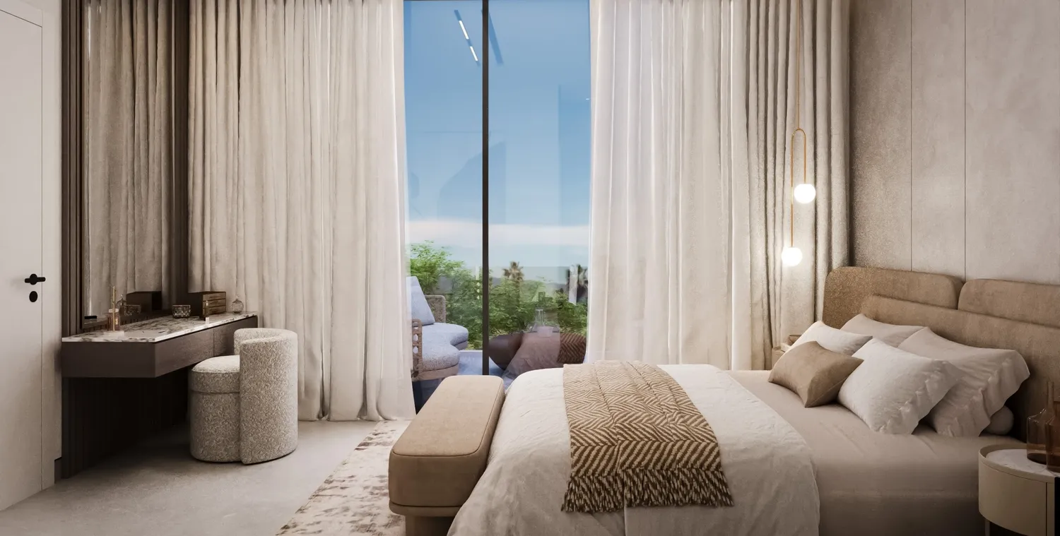 Interiors at AB Hills feature modern, high-quality finishes with a neutral, timeless palette. Materials include large-format floor tiles, textured wall finishes, and floor-to-ceiling windows that enhance natural light. Kitchens are equipped with built-in cabinetry, stone countertops, tiled backsplashes, and integrated kitchen appliances. The apartments are semi-furnished, with fixed joinery and kitchen appliances included, while allowing residents flexibility to personalize living and bedroom spaces.
