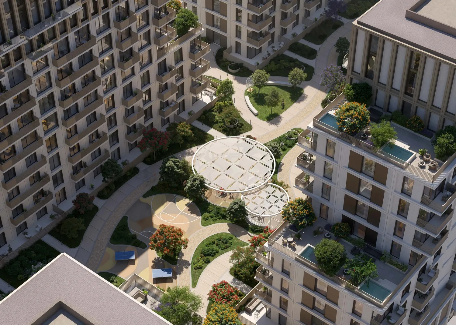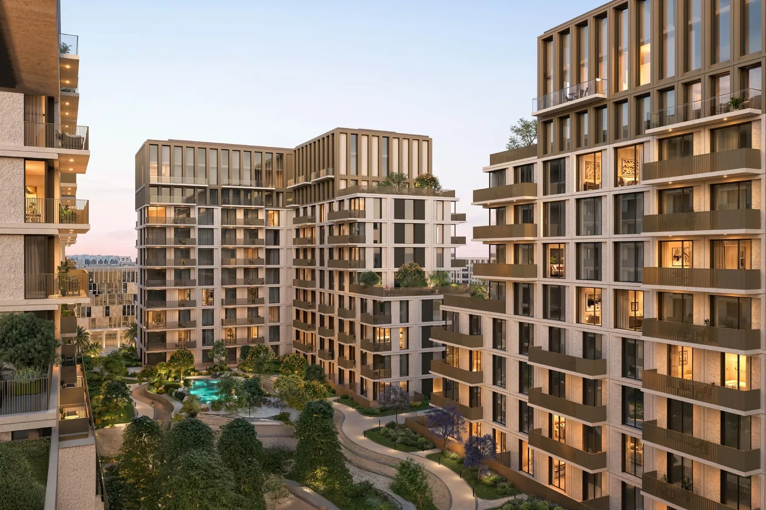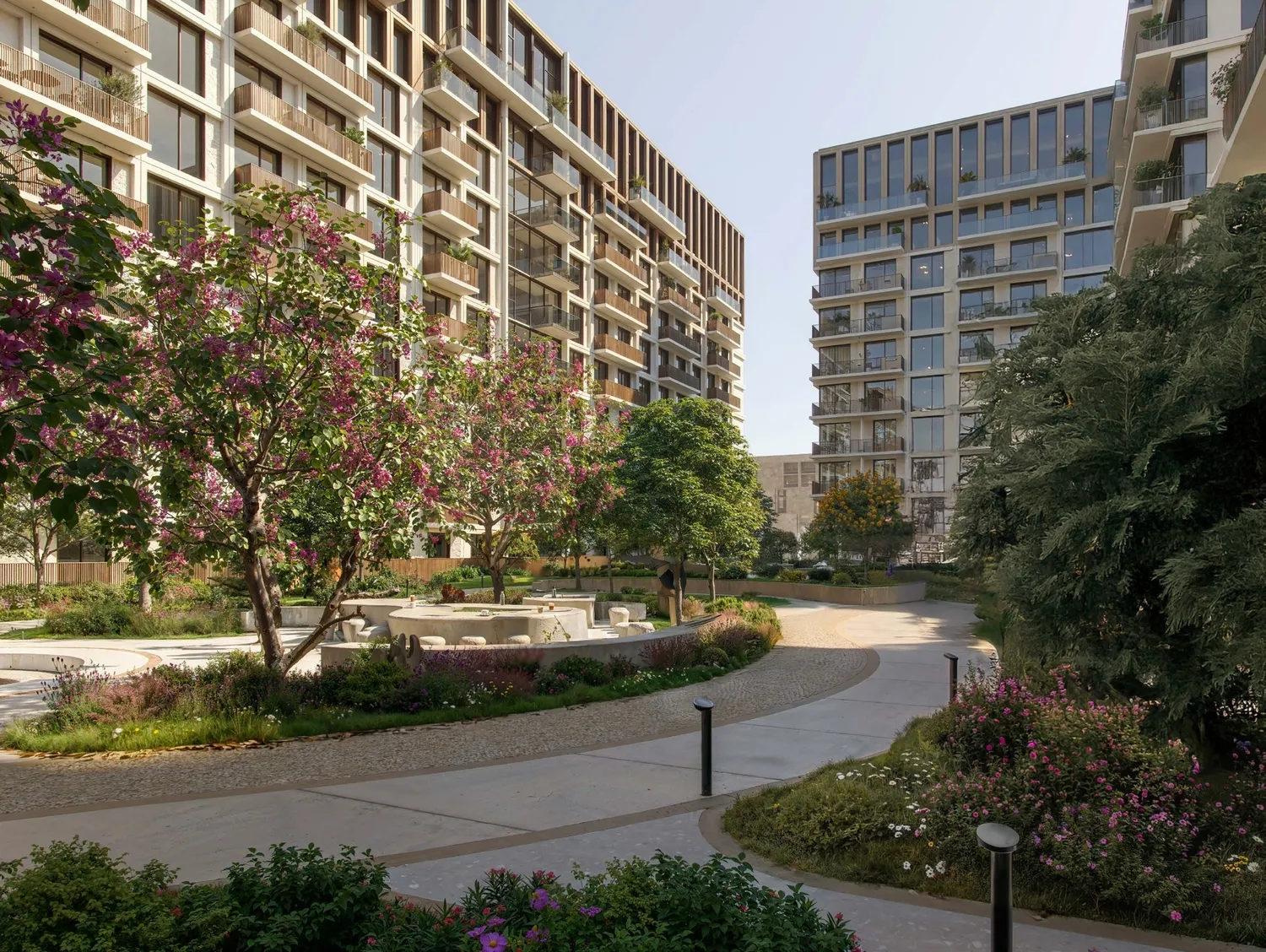 Interiors are finished with modern, high-quality materials and a clean, contemporary aesthetic. Apartments feature well-designed layouts with refined flooring, elegant wall finishes, and large windows that enhance natural light. Kitchens are fully fitted with quality cabinetry, durable countertops, and integrated appliances, while the residences are delivered semi-furnished, providing essential built-in elements that allow residents to personalize their living space.