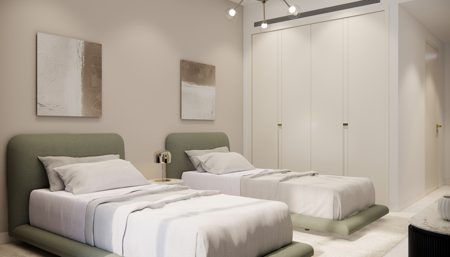 Minimalist luxury Art Deco design inspired by the UAE. Designed with Italian fixtures and fittings. Branded Chandeliers. Copper Bronze finish accessories. Smart home automation.
