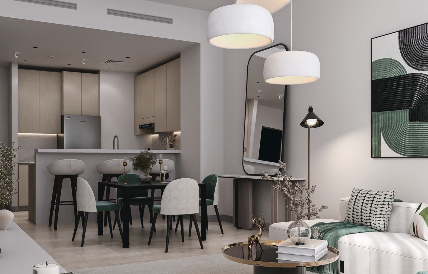 Incorporating floor-to-ceiling windows, the living areas are bathed in natural light, offering breathtaking views and a sense of openness. These spaces are designed for both tranquility and liveliness, making them perfect for everything from quiet moments with a book to lively family gatherings. With its focus on quality living and thoughtful design, Mass Residences redefines urban living in Jumeirah Village Circle.