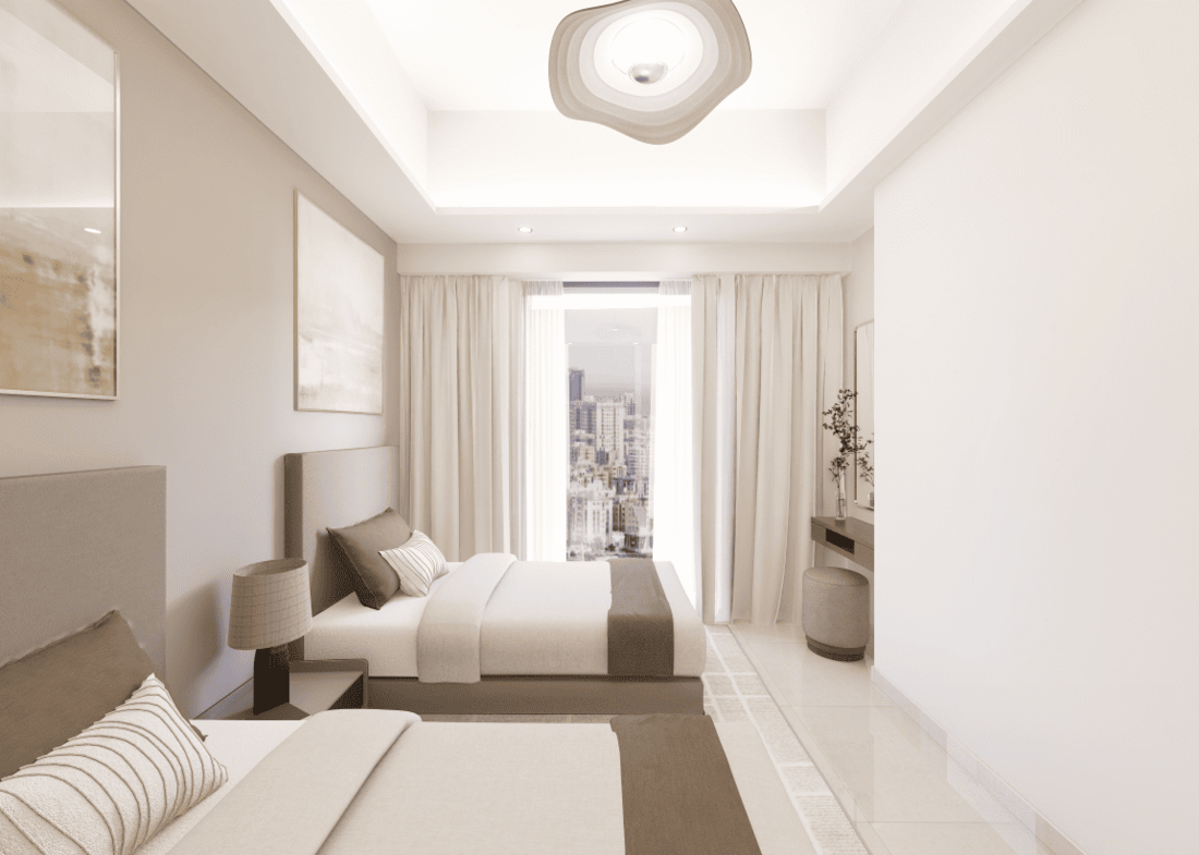 The tower offers a range of spacious studio, 1, 2, and 3-bedroom apartments, each designed with high-end finishes and innovative layouts. Rooms are crafted to maximize space and comfort, while large balconies provide panoramic views, offering a serene escape from the bustling city below. Built-in wardrobes and meticulously appointed interiors add to the refined experience within each residence.