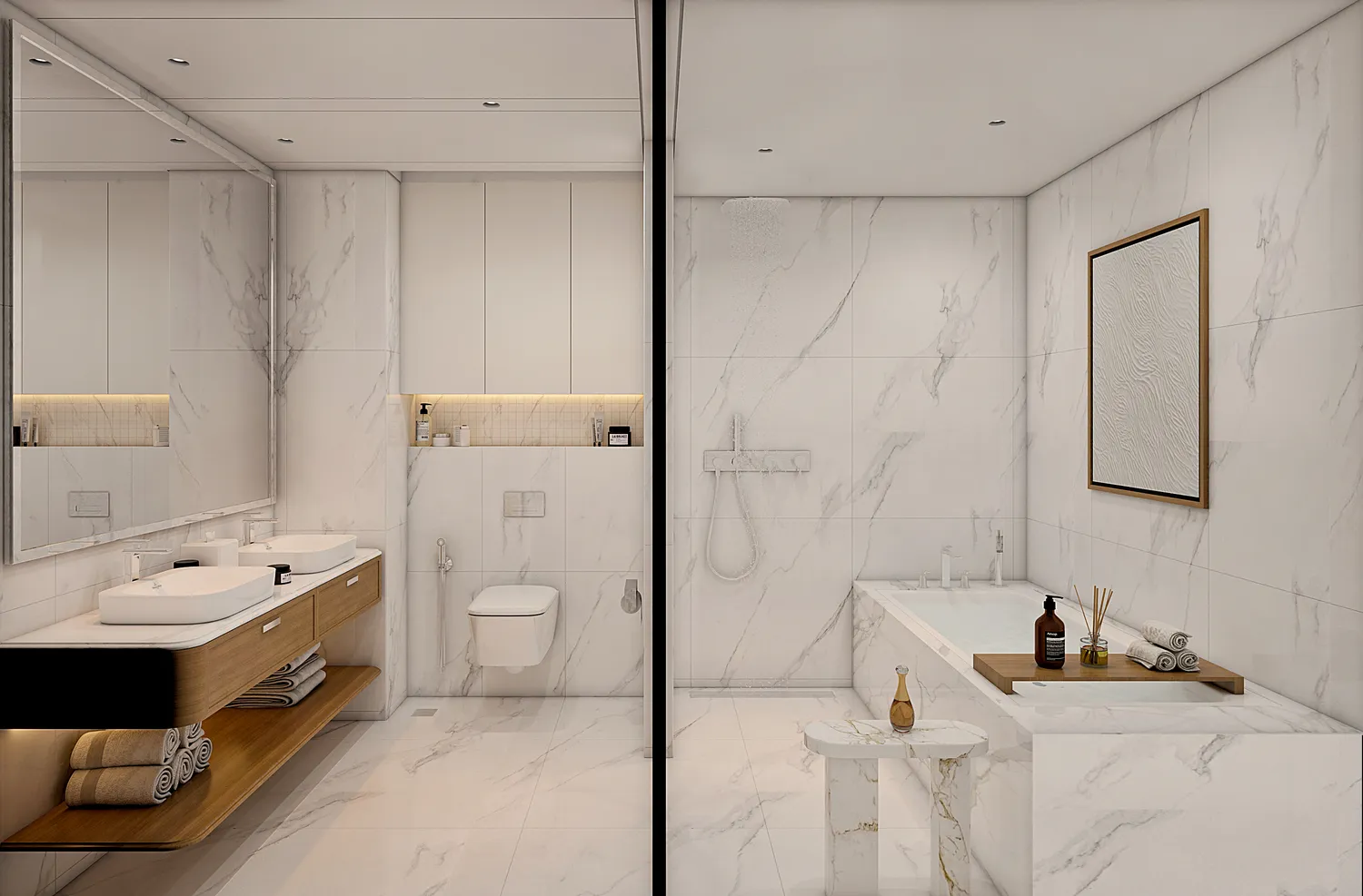 Riviera 60 features Italian marble flooring, premium wood joinery, and a modern interior palette focused on natural light, comfort, and durability. Kitchens are delivered with contemporary fitted layouts, while bathrooms include high-quality sanitary fixtures that complement the project’s refined aesthetic. Although furniture brands are not specified, the development offers consistent premium finishes throughout, reflecting Azizi’s signature commitment to craftsmanship and polished design.
