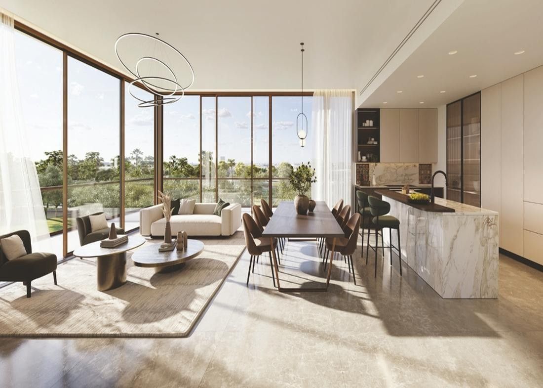 The collaboration of Woods Bagot, Mustard & Linen in crafting the interiors results in a captivating concept that elevates the living space. The opulent architectural craftsmanship, along with carefully positioned windows and balconies, contributes to a thoughtfully designed and aesthetically pleasing facade. This avant-garde development aspires to achieve Estidama 3 Pearl rating, Fitwel, and LEED Gold Certification, setting a benchmark for sustainability.