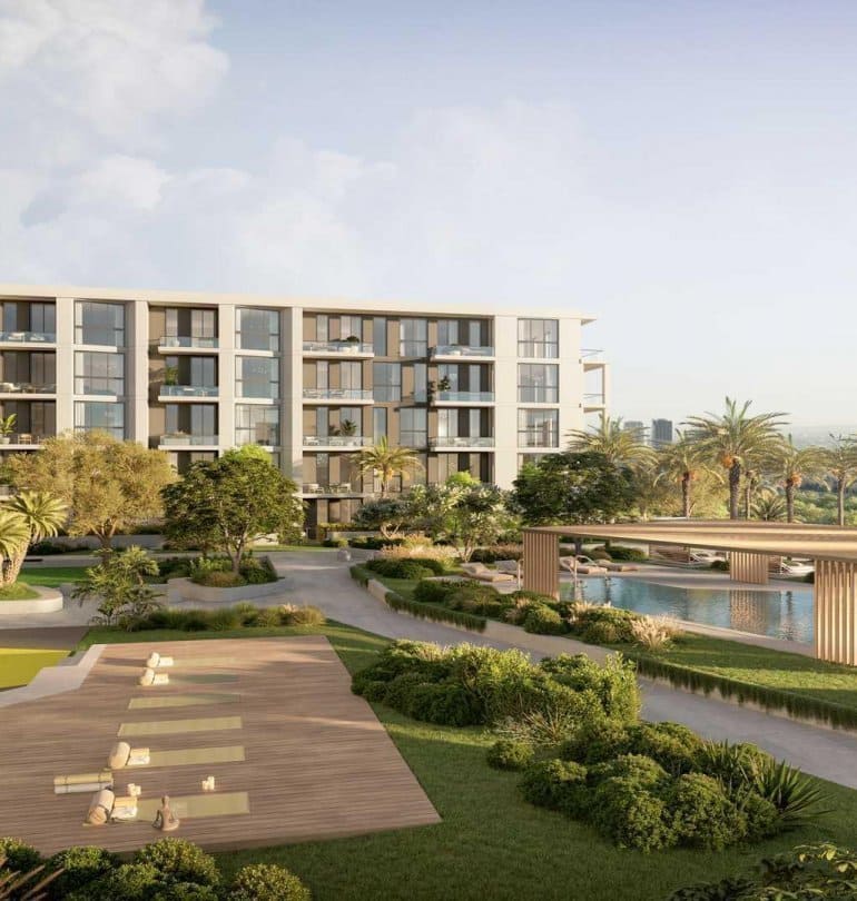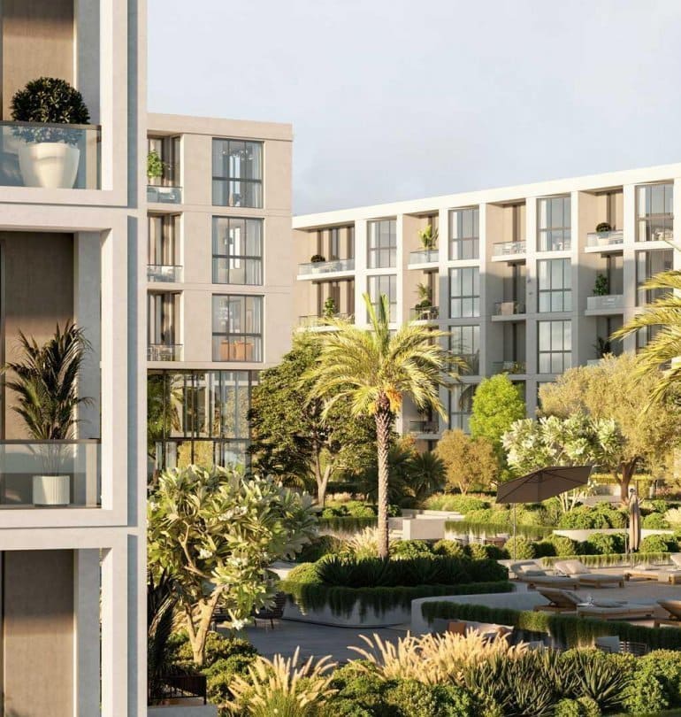 The living spaces are characterized by a thoughtful design that makes the layout and rooms radiate harmony and tranquility. With décor in warm earthy greens, browns and blues, your home will seem like a serene haven amidst the bustling atmosphere of Dubai. Each apartment has at least one balcony or terrace with views of the surrounding area.Â