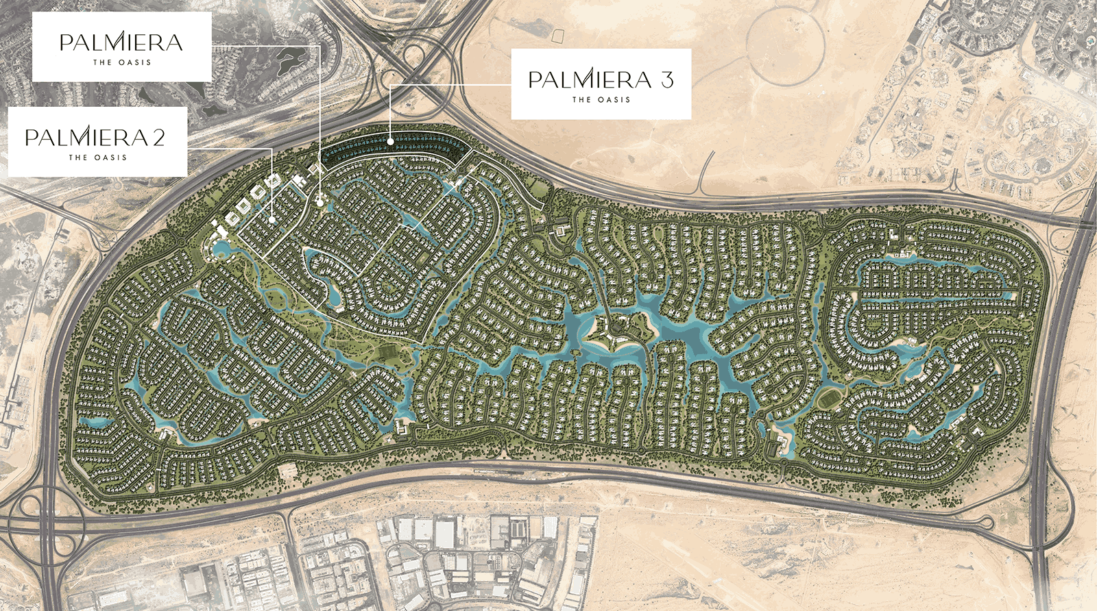 The Oasis Palmiera is part of Dubailand district. Dubailand would have an area twice the size of Walt Disney World. Dubailand was divided into six zones (worlds): Attractions and Experience World, Sports and Outdoor World, Eco-Tourism World, Themed Leisure and Vacation World, Retail and Entertainment World, and Downtown, the largest collection of theme parks in the world.