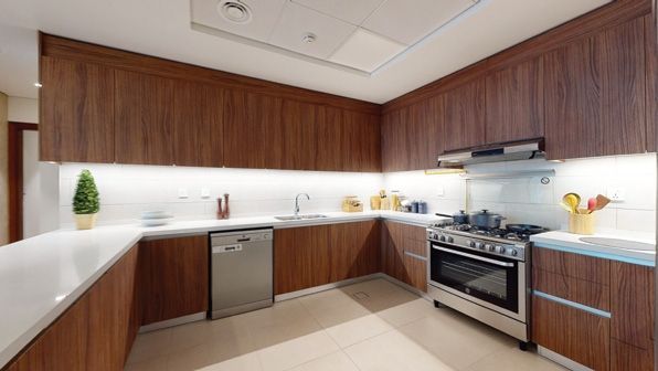 Quartz Stone CountertopsÑŽ Fitted With Professional-standard Appliances. Built-in Refrigerator, Gas Cooktop, Stainless. Steel Oven, Dishwasher And Ventilation Hood. Vitrified Porcelain Tiled Floor. Emulsion Paint For Walls. Wood Finish Laminated Italian Kitchen Cabinets. With Cove Lights